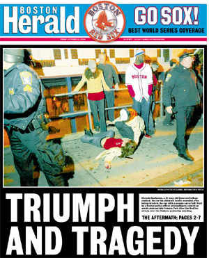 On Friday, the Boston Herald ran a large cover photo of a Boston Red Sox fan who died as a result of injuries she received when police fired pepper pellets into a crowd following the Sox victory on Thursday night. Since then the journalism world has been full of debate as to whether the photo, and an even more graphic one inside the paper, should have run. Here's a round up of coverage on the story. (Thanks to John Bolt of the AP for suggesting this topic.)